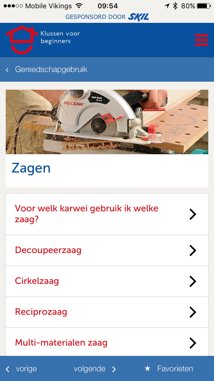 Ben je niet echt héél handig maar heb je wel zin om je handen uit de mouwen te steken? Dan is Klussen voor beginners (iOS en Android, gratis) een must. Deze app heeft meer dan zestig verschillende stappenplannen verzameld. Van het leggen van laminaat of het boren in keramische tegels tot het vervangen van een deurslot of het ophangen van een gordijnrail. Per stappenplan krijg je een overzichtelijke boodschappenlijst, enkele handige tips en stap-voor-stap-instructies met duidelijke tekeningen. Er zit zelfs een calculator in de app verwerkt om snel te berekenen hoeveel verf je voor die ene ruimte nodig hebt of hoeveel vierkante meter vloerbedekking je moet bestellen. Heb je nieuw materiaal aangekocht? Een bovenfrees, heteluchtpistool of schuurmachine bijvoorbeeld? Je krijgt per tool een overzicht van de karweien die je daarmee kunt uitvoeren én nuttige tips over het gebruik van het apparaat.