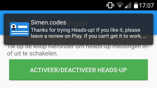 Het kan nu zijn dat je in eerste instantie dubbele notificaties krijgt, vanuit je telefoon zelf en de versie die Heads Up ervan maakt. Dat los je op door op je telefoon naar Instellingen / Applicaties te gaan en voor elke app waarvan je regelmatig notificaties ontvangt de schakelaar bij Spieden toestaan uit te zetten. Kost je even een paar minuutjes, maar dan heb je ook wat.