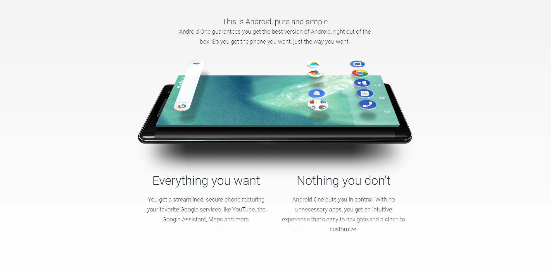 Android One schittert door de aanwezigheid van Material Design, een ontwerp wat we ook terugzien in populaire apps als Google Maps en Google Home. Smartphones met Android One hebben dan ook een launcher die hier prachtig op aansluit. Een launcher is een stukje software die bepaalt hoe je thuisscherm en icoontjes eruitzien. De Google Pixel heeft een launcher die heel erg lijkt op Android One. Logisch omdat beide producten rechtstreeks van Google komen.
