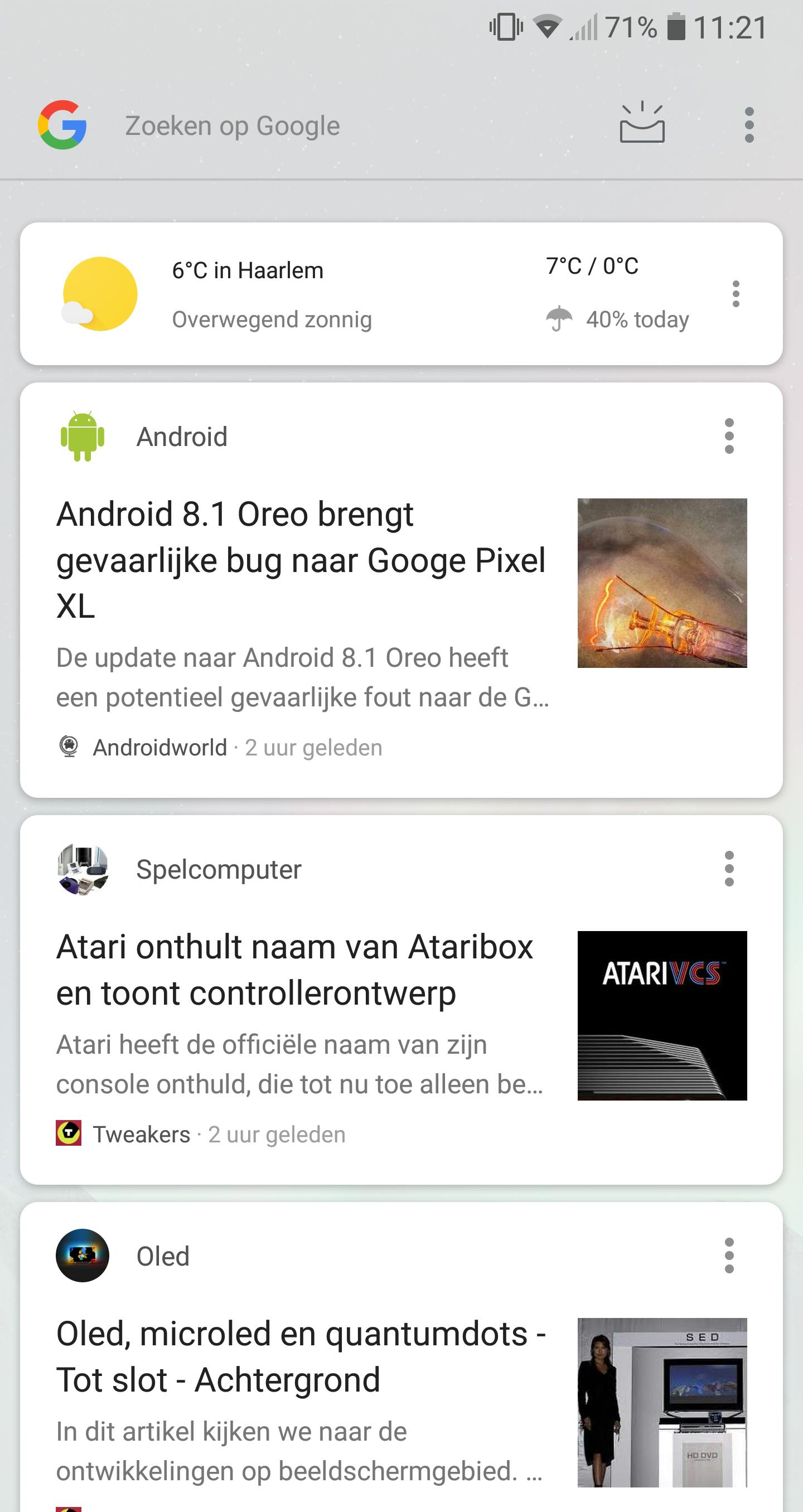 Een leuk voordeel van deze launcher is dat je naar rechts kunt vegen vanaf je thuisscherm om je persoonlijke tijdlijn van Google te zien. Deze ‘feed’ kun je volledig naar wens aanpassen door op de drie stipjes rechts bovenin het scherm te drukken. Zo kun je de feed zo instellen dat je alleen berichten ziet die jij interessant vindt. Tijdens het scrollen kun je op ieder moment weer naar links vegen om terug te gaan naar je thuisscherm. De implementatie van deze Google Feed is wat deze specifieke launcher zo geschikt maakt om de Android One-ervaring naar elke smartphone te brengen.