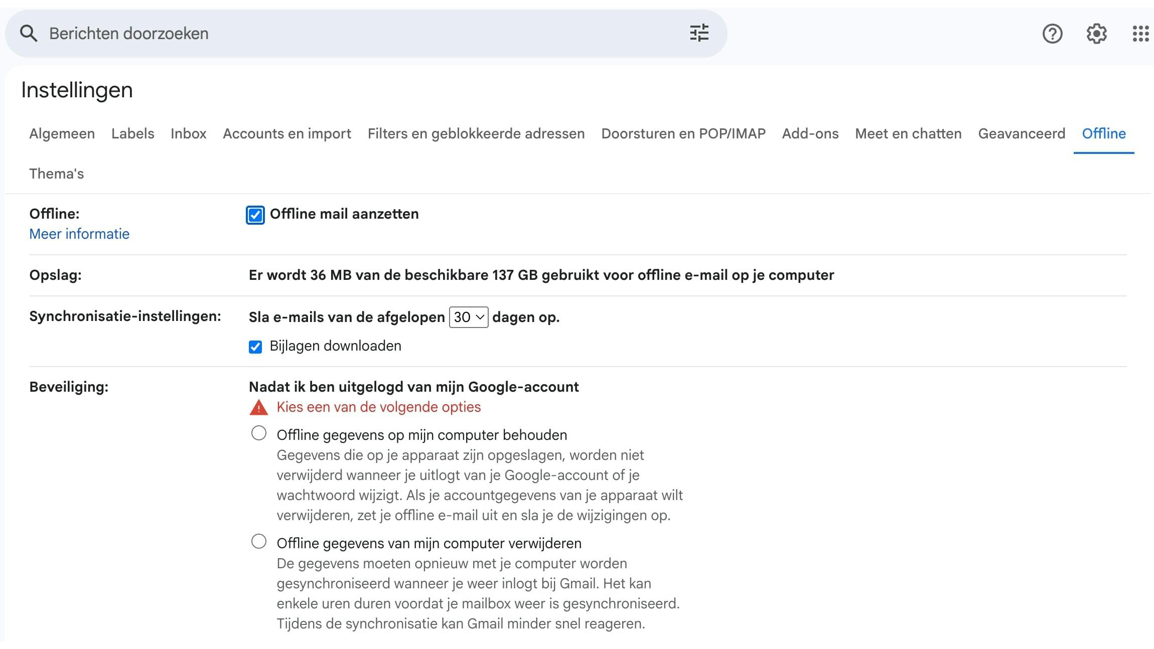 Als je veel onderweg bent, kun je in Gmail eenvoudig offline-ondersteuning activeren. Open Gmail in je browser, klik op Instellingen, kies Alle instellingen bekijken, ga naar tab Offline en vink Offline e-mail inschakelen aan. Bepaal of de laatste 7, 30 of 90 dagen worden gesynchroniseerd, kies eventueel voor het opslaan van bijlagen en bevestig met Wijzigingen opslaan.