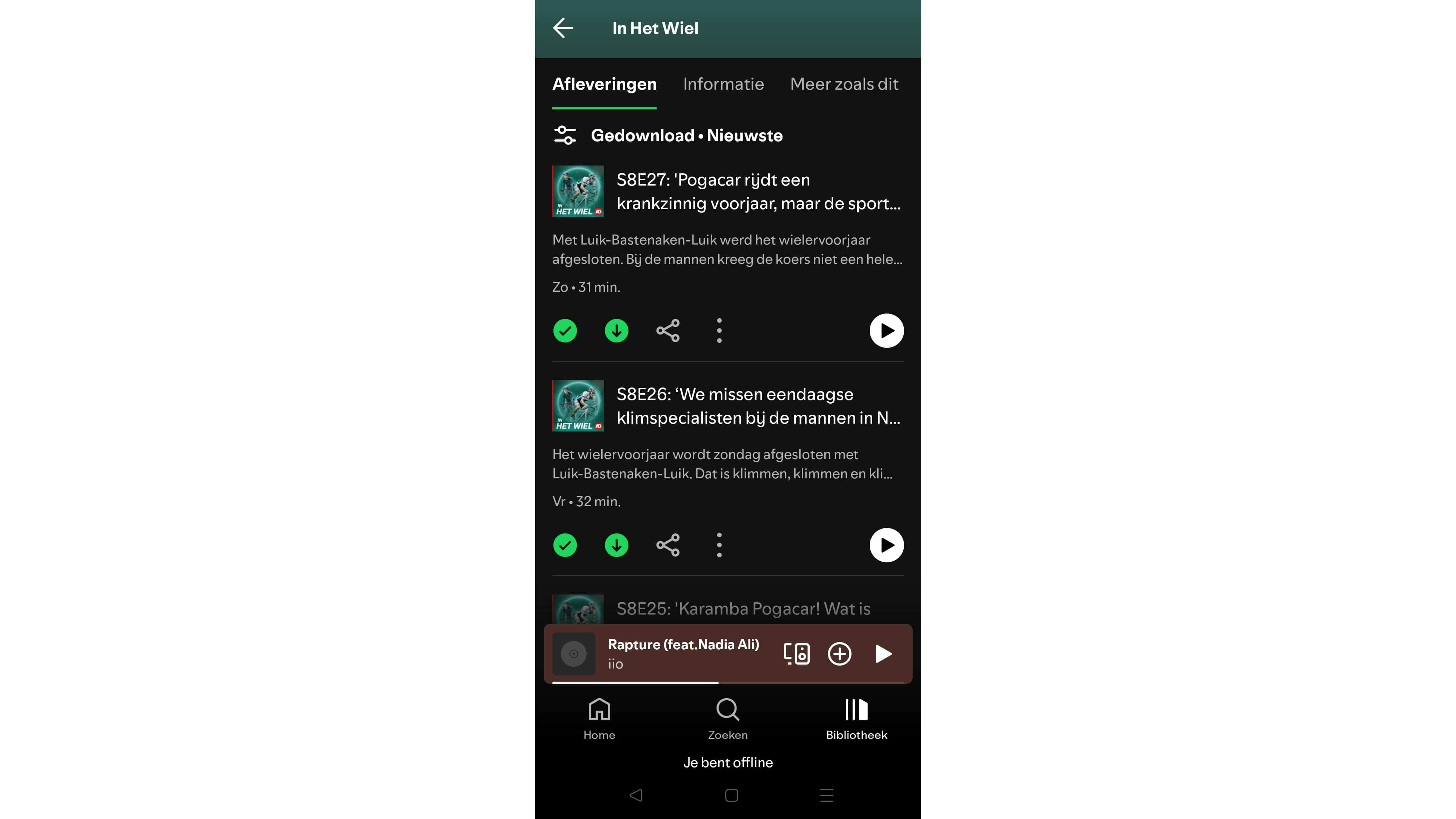 In Spotify vind je bij een podcastshow een downloadknop onder elke aflevering van je favoriete podcasts. Zet vliegtuigmodus aan en de afleveringen met een groen pijltje blijven afspelen. Dat laatste werkt hetzelfde in de desktopversie van de app. Ga naar de podcast die je offline wilt luisteren en klik per aflevering op het knopje met het omlaag wijzende pijltje. De afleveringen worden nu gedownload voor offline gebruik.