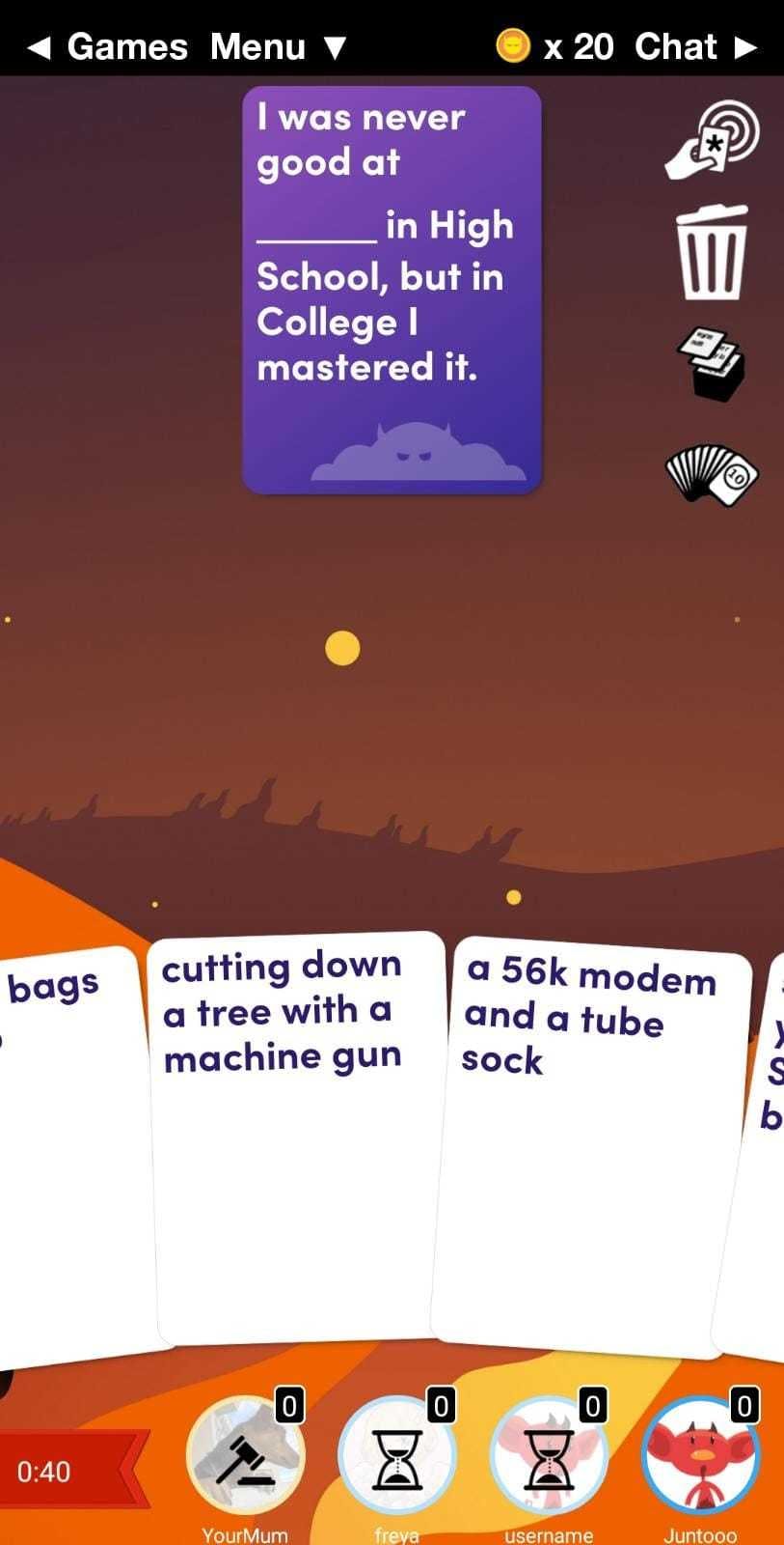 Evil Apples is de online equivalent van Cards Against Humanity. Evil Apples bidet 4 verschillende soorten game modussen. Je kunt kiezen uit Classic, Bizarro, Survivor of Random. Je speelt alle spellen met minimaal 3 deelnemers. Degene die de vraag stelt, mag net als met Cards Against Humanity het grappigste antwoord kiezen. In de game zelf kun je ook aparte decks kopen met een specifiek thema zoals boekwurmen, honden of dino’s.