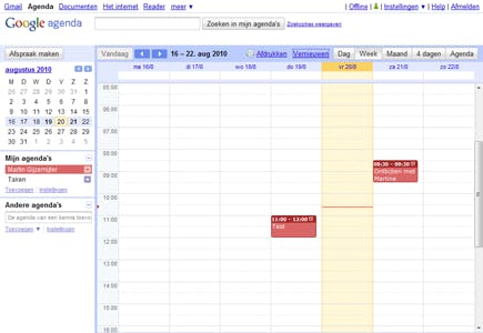 Sinds iOS 4 heeft Apple ondersteuning voor Google Agenda gewoon ingebouwd in de mailfunctionaliteit. Bij het toevoegen van uw mailaccount kunt u nu kiezen voor synchronisatie met de agenda. Zorg uiteraard eerst dat u een agenda hebt aangemaakt via www.google.com/calendar. U doet dit door na het inloggen te klikken op Toevoegen onder Mijn agenda's. Vul een naam in en klik op Agenda Maken. Klik op een plek in de agenda om een afspraak toe te voegen, zodat u straks duidelijk kunt zien dat de synchronisatie geslaagd is.
