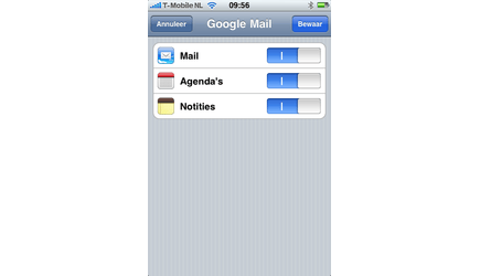 Blader vervolgens op de iPhone naar het menu Instellingen en druk op Mail, Contacten, Agenda. Druk daarna op Voeg account toe en kies voor Google Mail. Vul de benodigde gegevens in (naam, e-mailadres, wachtwoord en beschrijving) en druk op Volgende. Vervolgens kunt u aangeven wat er gesynchroniseerd moet worden. Zorg ervoor dat in ieder geval de optie Agenda's is ingeschakeld en druk op Bewaar.
