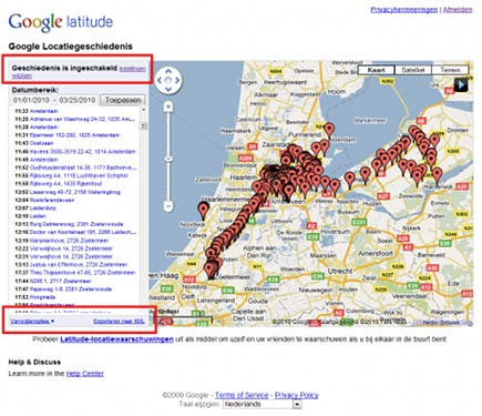 Google Latitude is erg handig om altijd op de hoogte te zijn van waar uw vrienden zijn en om hen te laten weten waar u zelf uithangt. Omdat het op een smartphone draait, hebt u geen apart navigatiesysteem nodig. U schakelt Latitude gewoon in en laat het op de achtergrond meedraaien. Het lijkt alsof alleen uw huidige locatie te zien is en u niet kunt uitpluizen waar u eerder op de dag geweest bent. Toch is het wel degelijk mogelijk, blijkt als u met de pc Google bezoekt. U kunt Google namelijk uw locatiegeschiedenis laten bewaren, zodat deze later terug te zien is in Google Maps of Google Earth. Erg leuk, zo weet u altijd waar u geweest bent en hoe laat dat was. Deze gegevens zijn alleen door u te zien en niet door uw vrienden. Zodra u zich met uw Google-account aanmeldt, ziet u onderaan de pagina het kader Instellingen. Met de knop Locatiegeschiedenis inschakelen laat u Google in het vervolg uw locatie bewaren zodra u Google Latitude op uw telefoon aanzet.