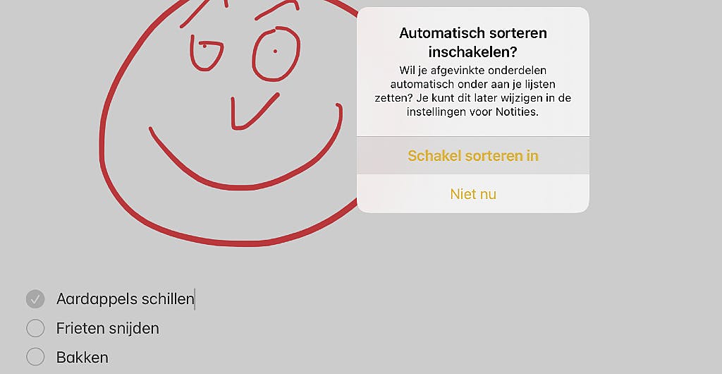 Heb je een taak uitgevoerd, dan tik je in de cirkel waarna deze een vinkje krijgt. Mocht je het willen, dan kan deze voltooide taak automatisch naar onderen verplaatst worden, zodat de nog uit te voeren en al uitgevoerde taken keurig bij elkaar komen te staan. Tik daarvoor op de optie Schakel sorteren in zodra daar om gevraagd wordt.