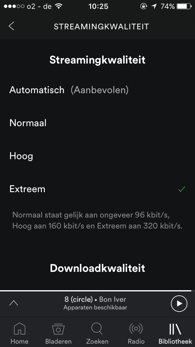 Het is handig om eerst te bepalen in welke kwaliteit je de muziek wilt downloaden. Belangrijk is hierbij uiteraard ook hoeveel ruimte je op je iOS-apparaat vrij hebt. Ga weer naar Bibliotheek / Streamingkwaliteit en selecteer één van de opties onder Downloadkwaliteit.