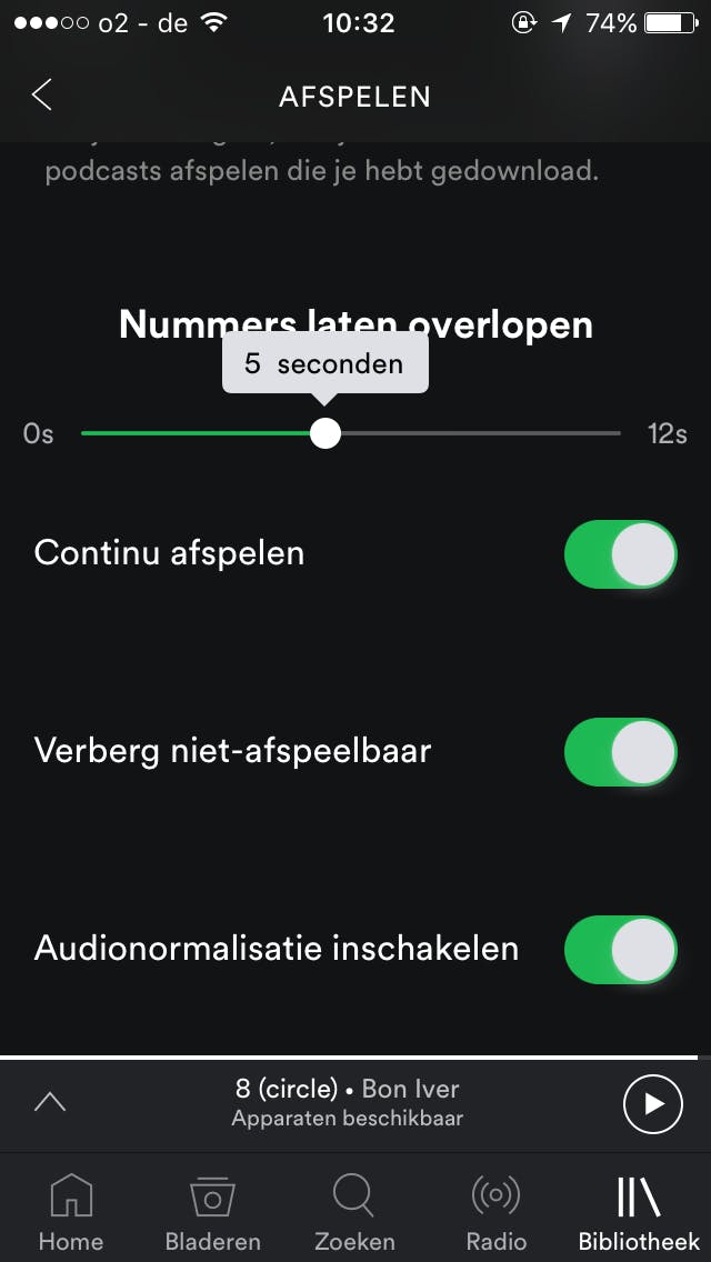 Ben je niet tevreden over hoe Spotify je muziek afspeelt, dan ga je naar Bibliotheek / Afspelen. Standaard wordt een nummer eerst volledig afgespeeld voordat een nieuw nummer wordt gestart. Als je de schuif onder Nummers laten overlopen op bijvoorbeeld 5s zet, dan zal de laatste vijf seconden van een nummer in het volgende nummer overlopen.