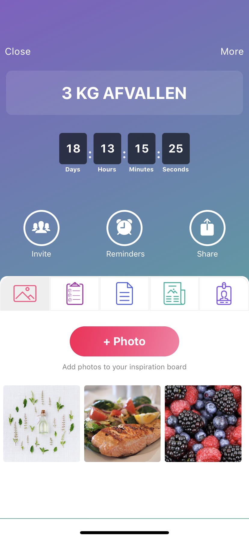Elke keer als je de app opent, kun je per doel foto’s, taken, je progressie, interessante artikelen of boeken en gebruikers toevoegen met de vijf gekleurde icoontjes. Via Invite, Reminders en Share kun je vrienden uitnodigen, je reminders aanpassen of je doel delen. Met de More-knop bovenaan is het mogelijk om je doel aan te passen, je deadine te verlengen of je doel af te vinken. Vervo oogt mooi en werkt fijn. Om je motivatie te verhogen, is het goed om vrienden uit te nodigen.