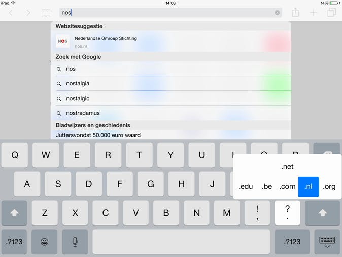 Als je een webadres wilt typen, eindigt dit normaal gesproken op .com of .nl. Je hoeft dit niet steeds in te typen. Houd je vinger op de punt-toets gedrukt en er verschijnen opties voor .com, .nl en nog een paar andere landcodes. Nog een snelle manier om naar websites te komen: als je een pagina vaak hebt bezocht of een pagina is erg populair, dan zie je bovendien het adres in de adresbalk van Safari al verschijnen. Om www.facebook.com te openen hoef je alleen maar 'face' te typen, Safari geeft automatisch www.facebook.com als suggestie in de adresbalk.