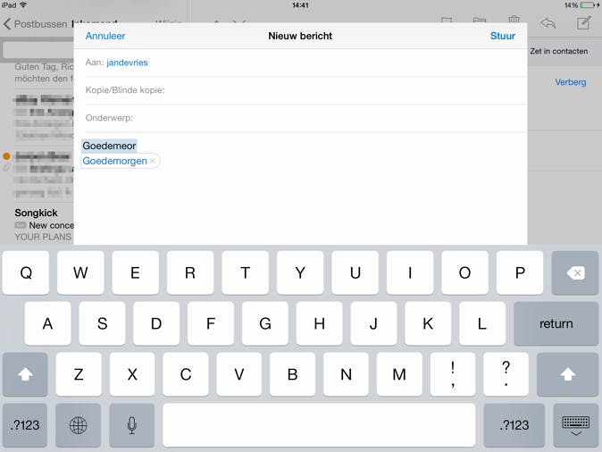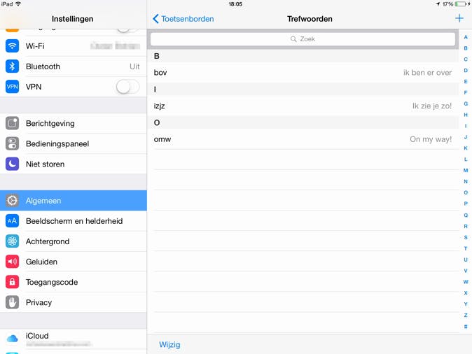 Je kunt natuurlijk elke keer intypen dat je vijf minuten later bent, maar het is veel handiger om dit soort standaardzinnen voor te programmeren. Dit kan vanuit het instellingenmenu. Tik op Algemeen / Toetsenbord en kies daarna voor Trefwoorden. Tik op het plusje en typ achter Trefwoord de afkorting waarmee je aangeeft dat je ietsje later komt. Zorg er wel voor dat dit een niet bestaand woord is. Je zou bijvoorbeeld kunnen kiezen voor bov, achter Zin zet je dan Ik ben er over. Als je nu in een app het woord bov typt, maakt je iPad er automatisch Ik ben er over van.