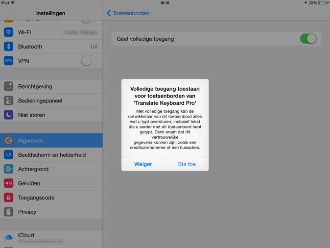 Sinds iOS 8 is het mogelijk om toetsenborden van andere aanbieders op je iPad te installeren. Handig als je bijvoorbeeld een toetsenbord wilt hebben waarmee je met veegbewegingen kunt typen. Of als je nog meer emoji's tot je beschikking wilt hebben. Een extern toetsenbord installeer je in eerste instantie niet via het instellingenmenu, je moet eerst de desbetreffende app downloaden. Na installatie van de app voeg je het toetsenbord toe. De app mag je daarna niet verwijderen, anders ben je het toetsenbord ook weer kwijt. Waar je wel even over na moet denken, is dat een externe toetsenbord-app in de praktijk toegang heeft tot alles wat je typt en dus een veiligheidsrisico met zich meebrengt.