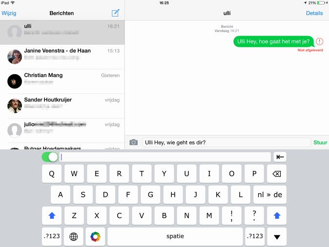 Als je live een ingetypte tekst wilt laten vertalen naar een andere taal, kun je de app Translate Keyboard Pro installeren. Na installatie ga je naar Instellingen / Algemeen / Toetsenbord / Toetsenborden en tik je op Voeg toetsenbord toe. Kies voor Translate Keyboard Pro. Eenmaal toegevoegd, tik je er nogmaals op en zet je de schuif achter Geef volledige toegang aan. In een app tik je nu op de wereldbol, selecteer je Translate Keyboard Pro en tik je vervolgens op de toets links van de spatiebalk. Achter Source Language kies je Dutch (nl) en achter Target Language selecteer je de taal van je conversatiepartner. Sluit af door op Done te tikken. Zet de schuif voor Tap to focus and type text aan en begin in het veld te typen. Waar normaal gesproken de Enter-toets zit, vind je nu de knop nl > de (als je het toetsenbord hebt ingesteld op Duits als doeltaal). Tik erop en het bericht komt in het Duits in je app te staan. Als je op de knop rechtsboven drukt, vertaal je een inkomend bericht naar je brontaal.