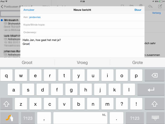 Een andere handige functie is om het toetsenbord van je iPad te splitsen. Houd je vinger op de toets rechtsonder en kies voor Splits. De toetsen worden nu kleiner en verplaatsen zich naar de linker- en rechterkant van je iPad. Zo kun je de iPad met twee handen vasthouden en met beide duimen typen. Je vindt hier ook de optie Zwevend. Dit betekent dat het toetsenbord zich naar het midden van het scherm verplaatst. Het hele toetsenbord laten verdwijnen doe je door één keer op de toets rechtsonder te tikken.