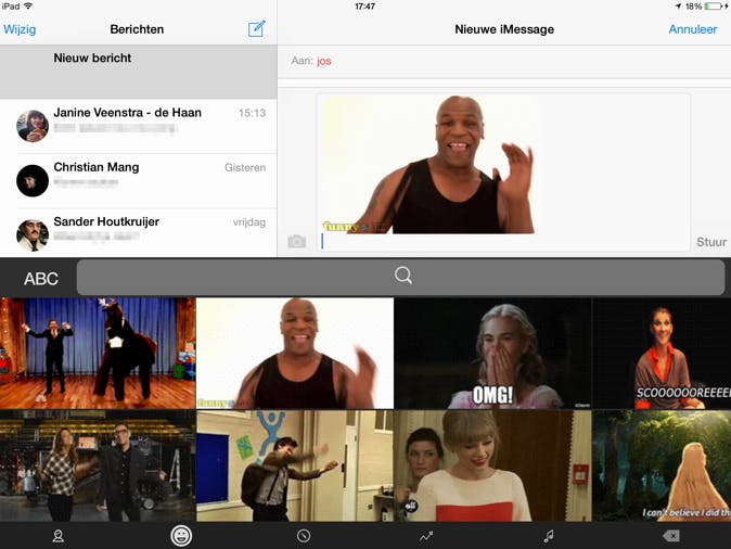 Als je ervan houdt om gifjes in berichten te plaatsen, is Fleksy Keyboard een goede app. Tik op GIF en kies één van de categorieën onder in beeld. Tik op een bewegend plaatje en op de plek waar je de gif wilt invoegen, kies je voor Plak. Ook op het gebied van emoji's is Fleksy Keyboard ongeëvenaard, zo'n 800 vind je er terug. In de app kun je ook verschillende extensies en thema's downloaden. Drie extensies krijg je bij aankoop gratis, voor elke extra extensie moet je 99 cent betalen. Sommige extensies zijn best handig, zo maak je met de extensie One-Handed het toetsenbord kleiner zodat je met één hand makkelijker kunt typen. De thema's zijn niet heel erg nuttig, hiermee verander je de achtergrond van je toetsenbord.