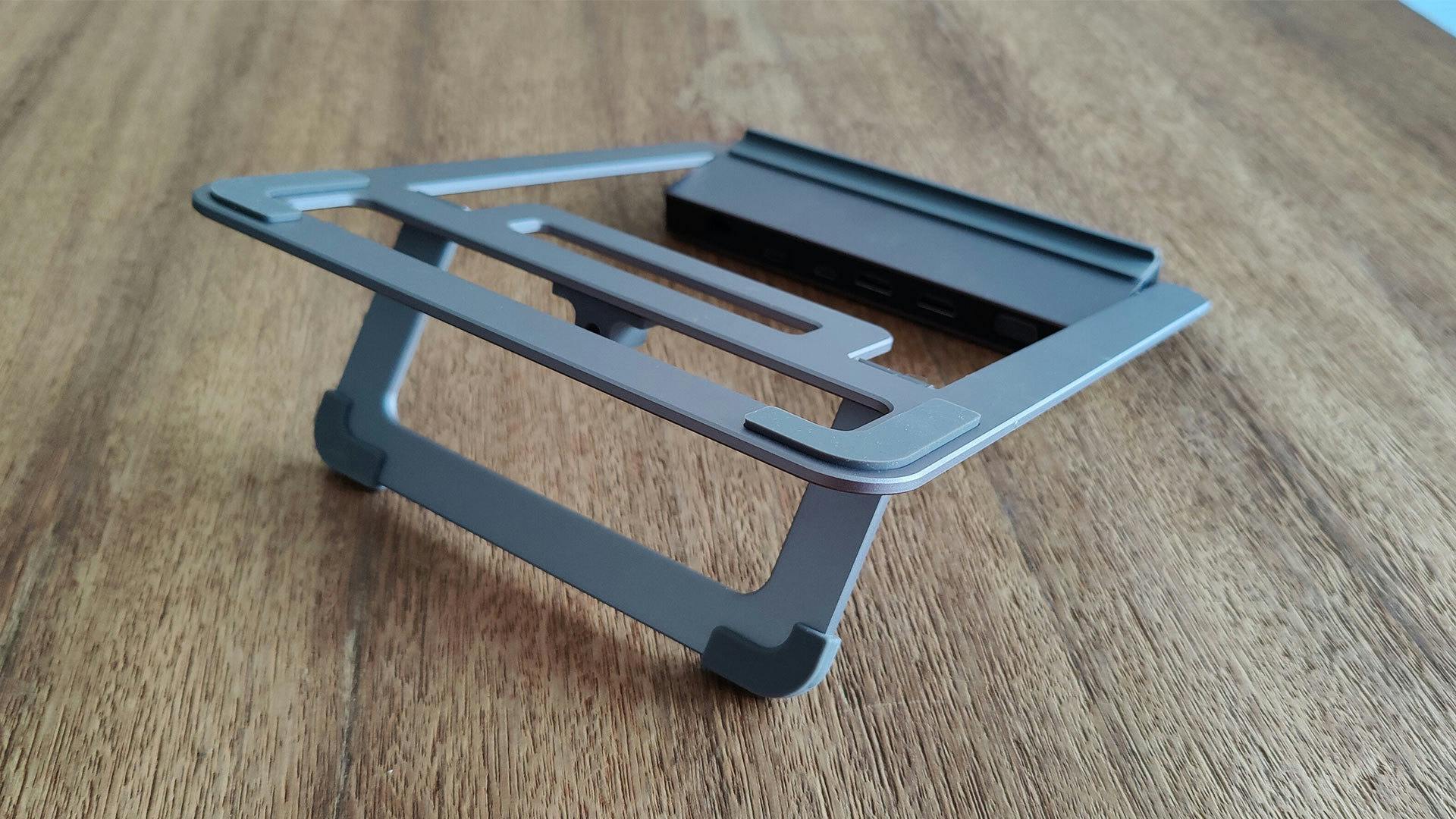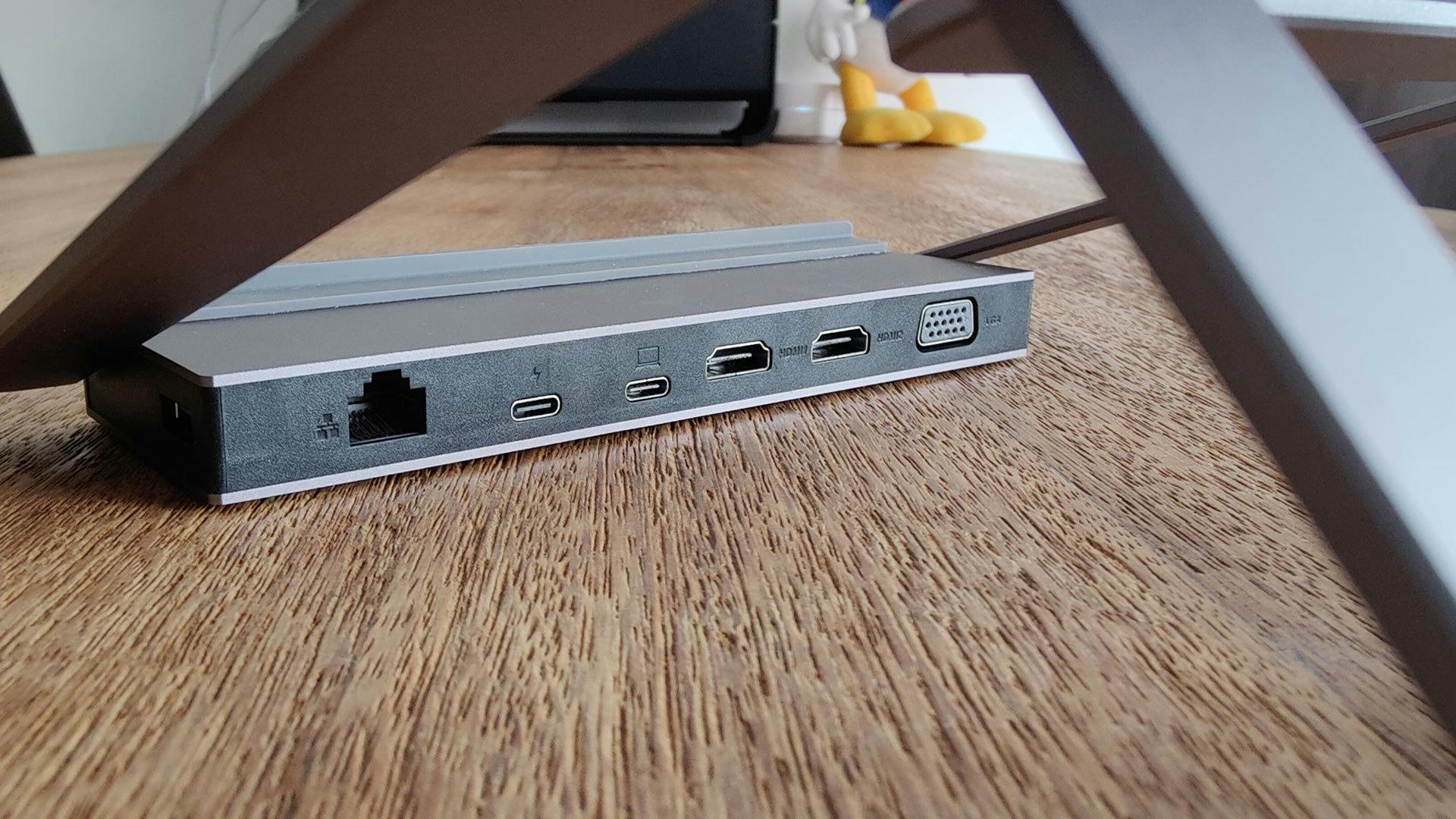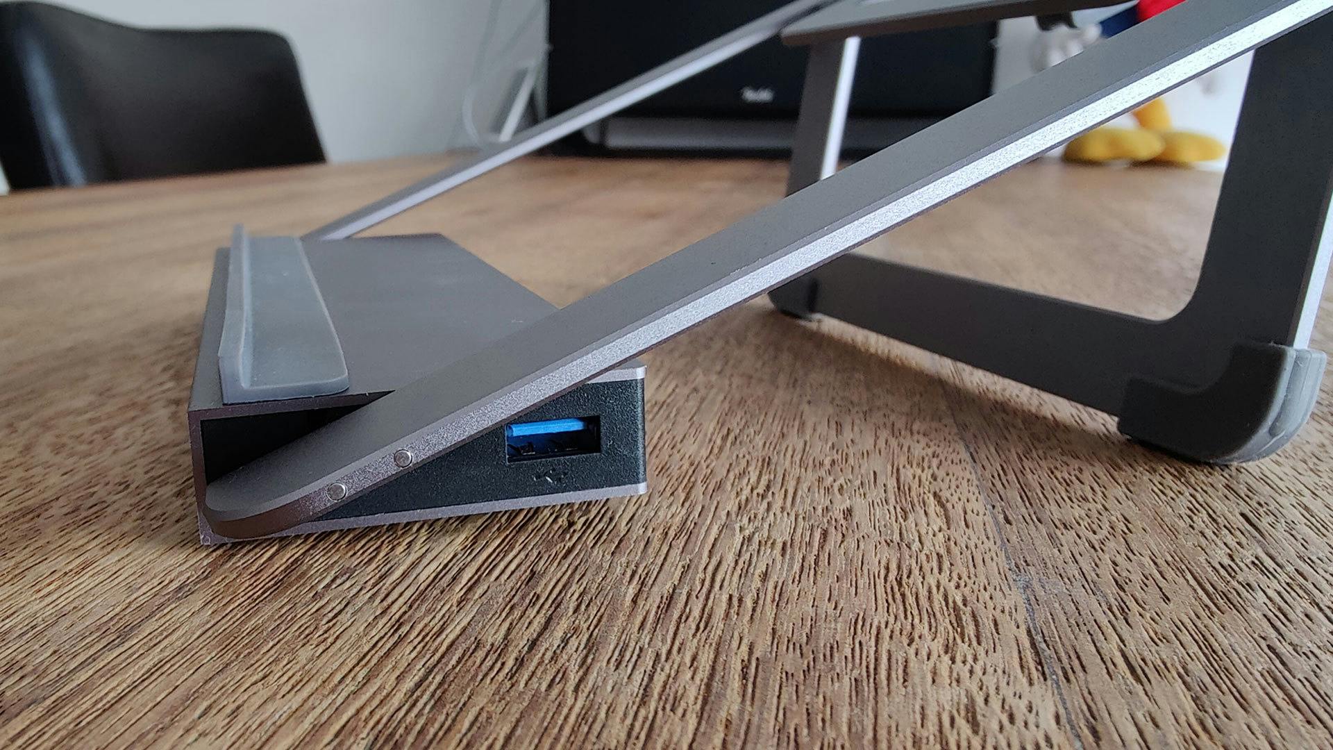 Dat laatste geldt overigens ook voor de vga-aansluiting, mocht je die echt nog nodig hebben, en de ethernetpoort. Op datzelfde stukje zitten ook de usb-c-aansluitingen. Het zijn typische aansluitingen waar je zelden van kabel hoeft te wisselen, daarom is het goed om te zien dat je die netjes kunt wegwerken. Voorop zitten andersoortige aansluitingen, die je wel degelijk vaker gebruikt. Denk dan aan de slots voor de twee soorten sd-kaarten, de audiojack en twee usb-poorten. De andere twee usb-a-poorten zitten overigens aan de zijkanten van de voet. Die twee poorten zijn minder toegankelijk dan je zou willen, maar dat is afhankelijk van de grootte van je laptop of toetsenbord.