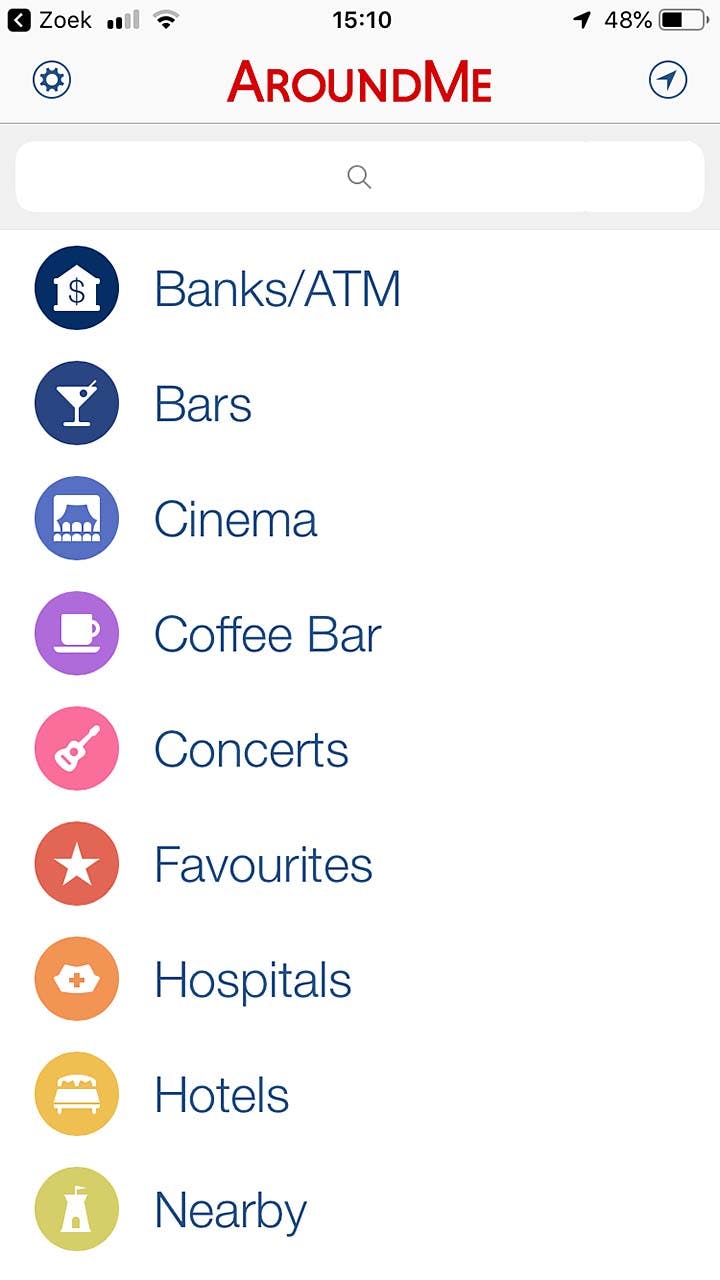 Ben je ergens in den vreemde aanbeland, en zoek je een restaurant, benzinepomp, theater of ander 'point of interest', dan is de app AroundMe ideaal. Het betreft hier geen complex geheel bomvol nutteloze informatie, maar een simpel in het gebruik zijnde app. Kies uit een lijst met categorieën en zie wat er zoal rondom je heen te vinden is. Of zoek op een naam of omschrijving. Heb je eenmaal iets van je gading gevonden, dan wordt de plek op een kaart getoond, via een tik navigeer je erheen. Kies voor het navigeren uit de standaard Kaarten-app, of een van de andere ondersteunde navigatie-apps, waaronder bijvoorbeeld die van Navigon.
