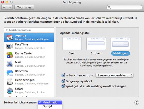 De instellingen van berichtencentrum zijn beschikbaar door via het Apple-icoon in de menubalk te kiezen voor de optie Systeemvoorkeuren en vevolgens te klikken op het icoontje Berichtgeving. Je krijgt nu aan de linkerzijde van het scherm een overzicht te zien met alle apps waarvan meldingen in het berichtencentrum kunnen worden weergegeven. Kies in deze lijst een app waarvan je de instellingen wilt aanpassen en selecteer deze.