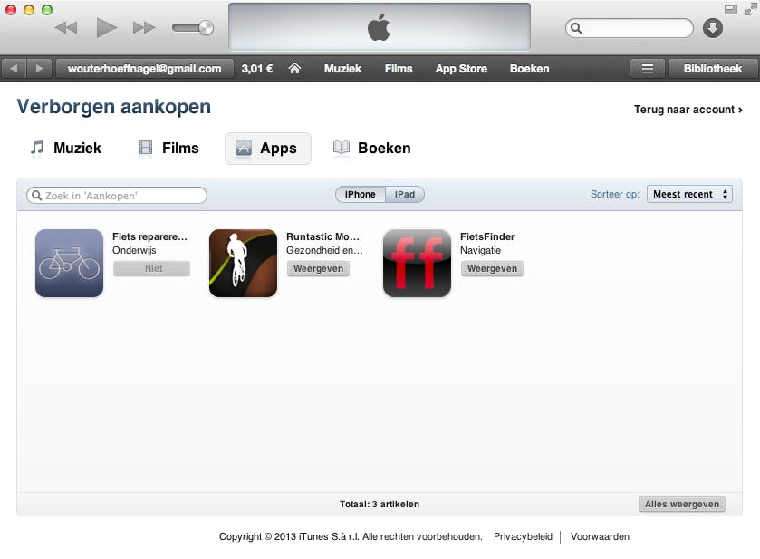Heb je de content gevonden die je weer zichtbaar wilt maken? Klik dan op de knop Weergeven naast de content om deze weer te vertonen. De content wordt direct zichtbaar in de lijst met aankopen op zowel je Mac, iPhone, iPad als iPod touch.