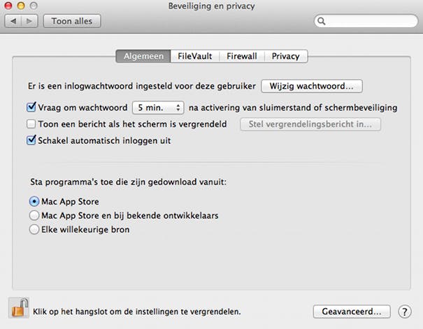 Wil je exotische apps van onbekende ontwikkelaars kunnen openen? Kies dan voor de optie Elke willekeurige bron. Let op, door deze optie te kiezen schakel je Gatekeeper eigenlijk volledig uit en moet je dus zelf goed op letten dat je alleen veilige software opent. Voordat je de instellingen kunt wijzigen moet je eerst op het slotje in de linkeronderhoek van het venster klikken en je wachtwoord invoeren.