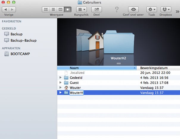 Bedenk allereerst de nieuwe gebruikersnaam die je wilt gebruiken. Heb je een naam verzonnen? Log dan in op het gebruikersaccount dat beheerdersrechten heeft en open de Finder via het dock. Klik in de menubalk op de knop Ga en selecteer de optie Computer. Je krijgt nu een overzicht te zien van de harde schijven die in je Mac aanwezig zijn. Open de harde schijf waarop jij OS X geïnstalleerd hebt. Deze schijf heet standaard 'Macintosh HD', maar het kan zijn dat je deze een andere naam hebt gegeven. Open op de harde schijf de map Gebruikers. Je krijgt nu een overzicht te zien van de thuismappen van alle gebruikers.