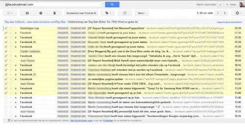 Het kan zijn dat je iemand bent die netjes elk mailtje dat je hebt gelezen weggooit. Maar als je iemand bent die eens in de zoveel tijd een grote opruiming moet houden, dan is de kans groter dat je iemand bent die mailtjes gewoon laat staan. Notificatiemailtjes die je krijgt van Twitter, Facebook, LinkedIn enzovoort, zijn niet groot, maar wel veelvuldig. Zo veelvuldig zelfs dat je in twee jaar tijd letterlijk honderden MB’s aan notificatiemails kunt verzamelen. Dat los je heel eenvoudig op: open een mailtje van het sociaal netwerk, kijk wat de afzender is, en kopieer dit adres naar het zoekveld in Gmail. Klik op het pictogram voor alles selecteren (de eerste knop onder het zoekveld) en vergeet niet om de link Selecteer alle conversaties die overeenkomen met deze zoekopdracht aan te klikken. Klik nu op verwijderen. Doe dit voor alle notificatiemails / nieuwsbrieven enzovoort, en je zult flink wat ruimte winnen.