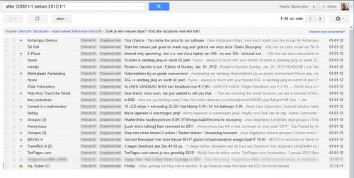 Natuurlijk is het ontzettend leuk dat je nog bij dat mailtje uit 2009 kunt, omdat je in Gmail alles bewaart. Maar is het echt nuttig? Tja, er is een kans dat er iets gebeurt, waardoor je nét dat ene mailtje voor de dag kan toveren dat je zo’n lange tijd geleden hebt gestuurd, maar kom op, wat is de kans, en daarbij, je kunt niet alle risico’s afvangen in je leven. Je kunt je oude mail heel eenvoudig verwijderen door er een zoekfilter van te maken. Stel, je bent in 2010 begonnen en je wilt alle mail van tussen begin 2010 en eind 2011 verwijderen. Vul dan in het zoekveld in: after:2010/1/1 before:2012/1/1. Er zal alleen mail uit de genoemde periode gevonden worden. Klik wederom op alles selecteren (inclusief het linkje Selecteer alle conversaties die overeenkomen met deze zoekopdracht) en je maakt in één klap schoon schip. IS je dat nog wat te gortig, dan kun je ook nog klikken op het pijltje omlaag in het zoekveld, en een vinkje plaatsen bij Bevat een bijlage, dan worden alleen mails met bijlagen getoond (dat ruimt natuurlijk extra snel op).