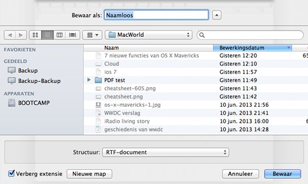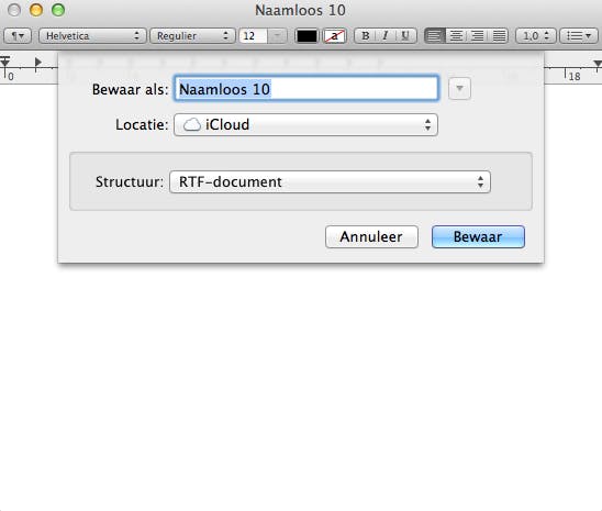 Wil je het bestand toch ergens anders opslaan? Dan kan je op de locatie klikken om een lijst te bekijken met de mappen die jij het meest gebruikt. Wil je map op een 'exotische' locatie opslaan? Dan moet je eerst op het pijltje naast de bestandsnaam klikken om door je Mac te kunnen bladeren. De nieuwe werkwijze wordt in nagenoeg alle apps die ondersteuning bieden voor iCloud gehanteerd. Denk hierbij aan apps van Apple zoals Teksteditor, Voorvertoning en Pages, maar ook aan Office for Mac van Microsoft.