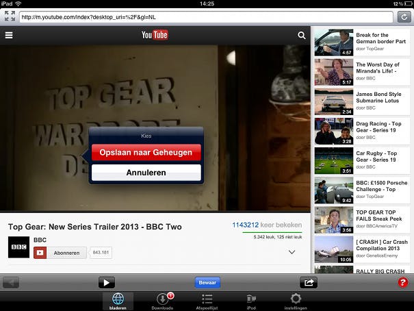 Heb je een leuke video gevonden? Open deze dan door op de video te klikken. Zodra de pagina is geladen begint de video te spelen en wordt automatisch een pop-up vertoond. De pop-up geeft je de keuze uit de opties Opslaan naar geheugen en Annuleren. Kies Opslaan naar geheugen om de video op te slaan. Video Downloader Super slaat nu de video op op je iPad.