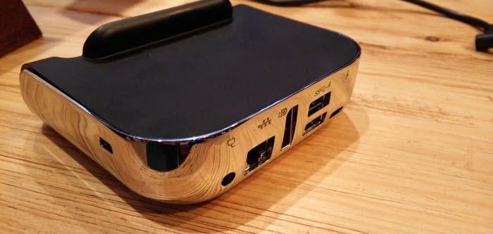 HP heeft een eigen dock gemaakt, een flink blok dat stijlvol is vormgegeven en mooi staat op je bureau, waarin je de Elite X3 via usb-C en hdmi kunt aansluiten op een beeldscherm. Aan de achterkant van het dock zitten nog een aantal extra aansluitingen zoals twee usb-poorten, een usb-C-poort, en zelfs een ethernet-aansluiting - die laatste heeft Microsofts eigen Display Dock niet eens.