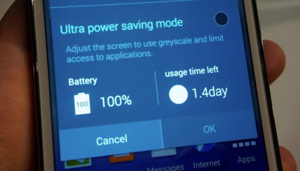 De Galaxy S5 heeft een Ultra Power Saving-modus die helpt voorkomen dat de telefoon zichzelf uitschakelt. Wanneer de batterij bijna leeg is schakelt hij over op deze modus, waardoor het scherm volledig zwart wordt en alle onnodige functies worden uitgeschakeld, en je alleen de basisdingen (zoals SMS en bellen) hebt. In deze modus kan de Galaxy S5 in stand-by 24 uur meegaan op 10 procent. Bij normaal gebruik gaat hij 10 uur mee bij web-browsen en 12 uur bij het afspelen van video, aldus Samsung.