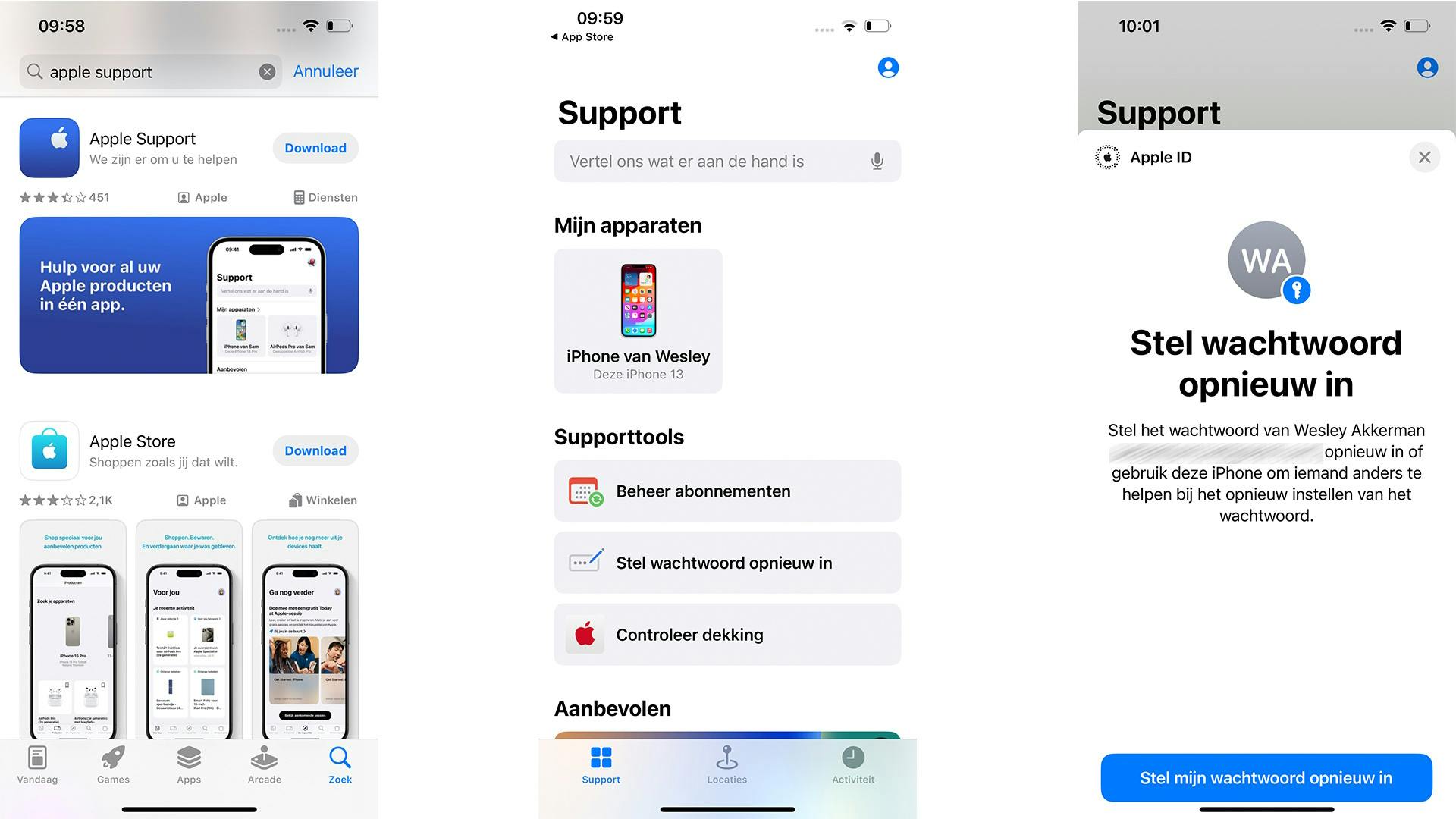 Heb je zelf geen ander Apple-apparaat, maar heb je wel een vertrouwd telefoonnummer ingesteld? Dat is meestal het nummer dat je gebruikt voor tweefactorauthenticatie; meer daarover lees je op deze pagina van Apple. Als dat het geval is, dan kun je daar ook gebruik van maken. Je hebt dan alsnog een Apple-apparaat nodig, maar dat kun je misschien lenen van een familielid of vriend. En anders kun je naar een fysieke Apple-winkel gaan, de situatie uitleggen en daar een leentoestel gebruiken. Je gebruikt je eigen telefoonnummer dan in de Apple Support-app. In sommige gevallen staat die al op een iPhone. Maar als dat niet het geval is, dan kun je hem gewoon uit de App Store downloaden.