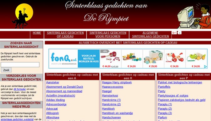 Het kan zijn dat je wel graag zelf het werk wilt doen, maar niet gezegend bent met epische rijmskills. In dat geval biedt een rijmwoordenboek uitkomst (want als Hazes het kon, kan jij het ook). Zonder twijfel het beste Nederlandse rijmwoordenboek op internet is www.rijmwoorden.nl. Grafisch een zeer belegen site, maar het gaat natuurlijk om de inhoud. Fijn is dat de site, in tegenstelling tot veel concurrenten, deze site niet alleen kijkt naar de letters, maar ook naar de klank. Dat maakt dit rijmwoordenboek uitstekend voor Sinterklaasrijms, omdat er ook hele gekke rijms kunnen ontstaan (zoals niets en beats).