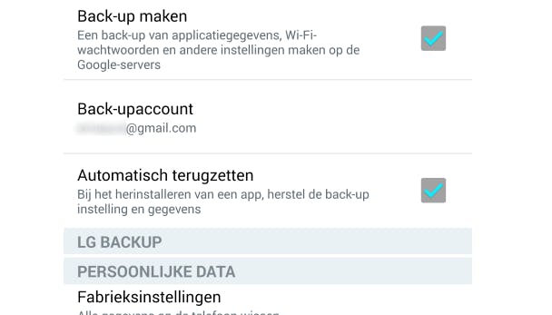 Wil je een op Android draaiende smartphone of tablet back-uppen, dan ga je naar Instellingen / Algemeen / Back-up & reset. Vervolgens vink je bovenaan Back-up maken aan en log je in met een Google-account via Back-upaccount. Zodra je klaar bent met de reservekopie, kies je onder Persoonlijke data voor Fabrieksinstellingen. Je krijgt een waarschuwing met de melding dat alle gegevens zullen worden gewist. Indien mogelijk en gewenst kun je onderaan ook nog MicroSD wissen aanvinken. Tik op Telefoon opnieuw instellen om de fabrieksinstellingen te herstellen. Bevestig met Alles wissen.