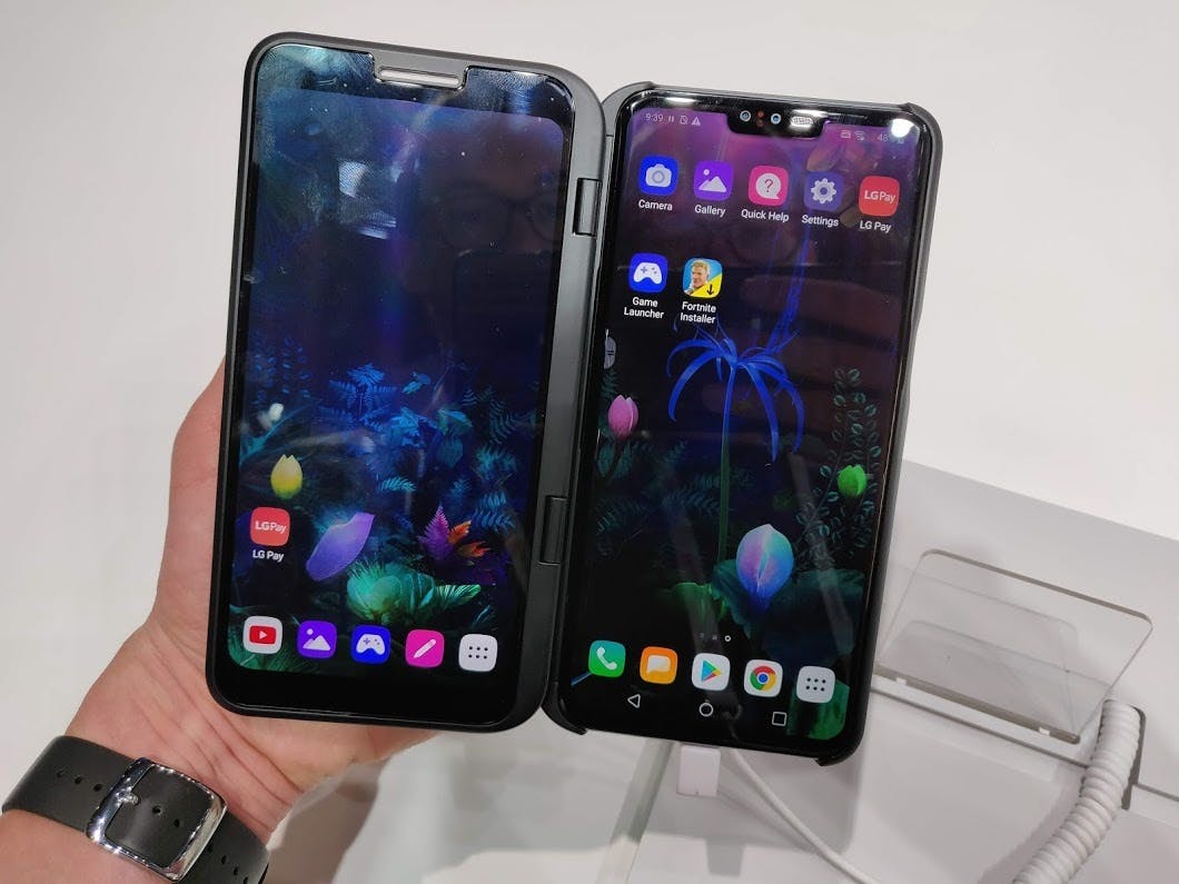 LG presenteerde in januari ’s werelds eerste oprolbare televisie, maar lijkt nog niet mee te doen aan de opvouwbare smartphone. Het bedrijf pakt het iets anders aan en komt met de Dual Screen-hoes voor zijn nieuwe V50 ThinQ 5G-smartphone. Deze hoes bevat een 6,2 inch full-hd oled-display en werkt zowel los van als in combinatie met het 6,4 inch scherm van de V50. Je kan bijvoorbeeld twee apps schermvullend naast elkaar gebruiken of het secundaire display gebruiken als gamepad of venster met camera-instellingen. Een interessant concept dat in de praktijk prima werkt, maar niet perfect is. Zo maakt de schermhoes de smartphone merkbaar dikker en zwaarder en voelt het geheel niet zo stevig aan. Bovendien vragen we ons af hoeveel mensen deze accessoire gaan kopen. Wij in ieder geval niet, want de V50 ThinQ 5G verschijnt zoals eerder gezegd voorlopig niet in Nederland.