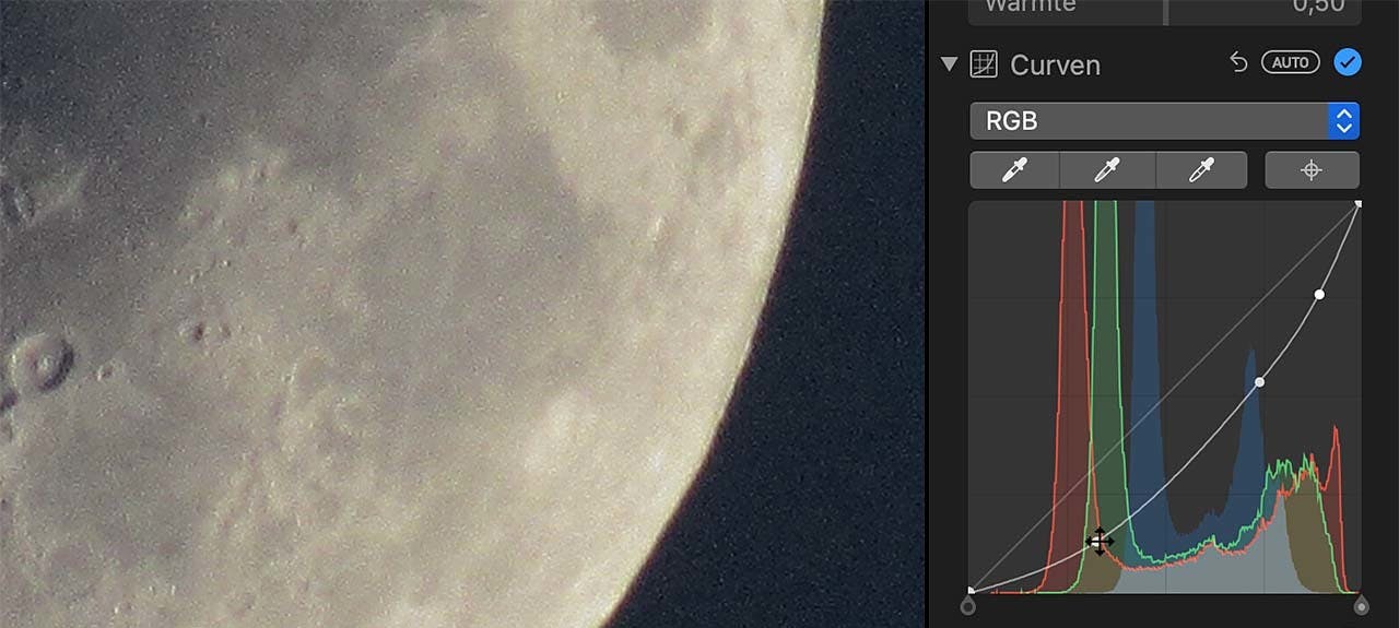 Onze maan ziet er alweer iets gezonder uit. Wat ons betreft mag er best iets meer kleur bij, dat doe je door in het paneel rechts gebruik te maken van de regelaar onder Kleur. Meer naar rechts levert vollere kleuren op, meer naar links blekere kleuren. Blijft over die vervelende ruis. Daarvoor maak je gebruik van de regelaar onder Onderdruk ruis. In dit meer extreme voorbeeld schuif je de regelaar Hoeveelheid een flink eind naar rechts. De ruis wordt nu een heel stuk minder! In de meeste gevallen zul je de regelaar niet zo heel veel naar rechts hoeven te zetten om ruis nagenoeg onzichtbaar te maken. Wel geldt dat ruisonderdrukking tot een minder scherp beeld leidt. Om dat weer deels tegen te gaan is er de regelaar intensiteit onder Scherper. Met de regelaar Randen zorg je voor scherpere randen, wat juist na ruisonderdrukking goed van pas kan komen. Wel geldt dat de ruis ook weer iets meer terugkeert bij verscherpen. Kortom: een kwestie van een beetje spelen met zowel ruisonderdrukking als verscherping.