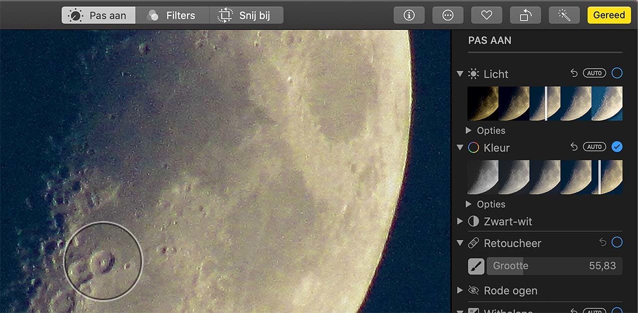 Foto's beschikt over talloze mogelijkheden. Denk bijvoorbeeld aan Retoucheer. Deze is bedoeld voor het verwijderen van vlekken en andere oneffenheden. Je pept er oude gevlekte foto's mee op, maar je verwijdert er net zo makkelijk (jeugd)puistjes en andere oneffenheden mee. Of maankraters. Net wat je wilt. Het werkt wel heel simpel. Klik op het kwastje voor de schuifregelaar Grootte onder Retoucheer. Pas eventueel de grootte van het gereedschap - in de vorm van een cirkel - naar wens aan met de regelaar. Klik vervolgens op alle onderdelen die je wilt verwijderen. Foto's is slim genoeg om zelf een vervangende textuur te verzinnen. Vaak gaat dat verbazingwekkend goed! Ben je tevreden met je bijgewerkte foto, klik dan op de knop Gereed rechtsboven in het Foto's-venster. Leuke bonus: als je ooit in de toekomst weer terug wilt naar de originele foto, dan open je de bewerkte foto weer om vervolgens op Bewerk te klikken. Klik dan in het paneel rechts helemaal onderaan op Stel aanpassingen opnieuw in en je foto is weer terug bij af.