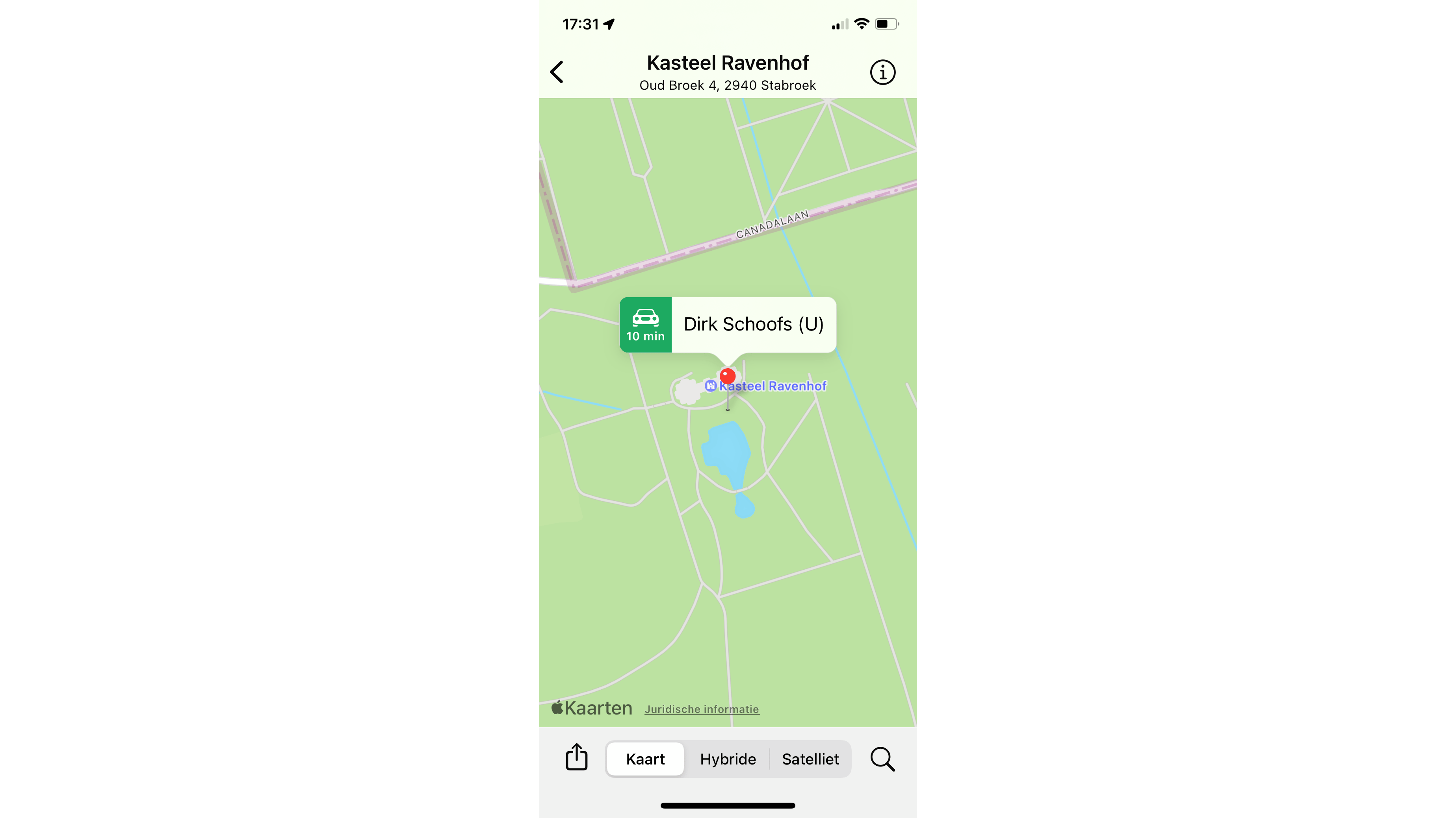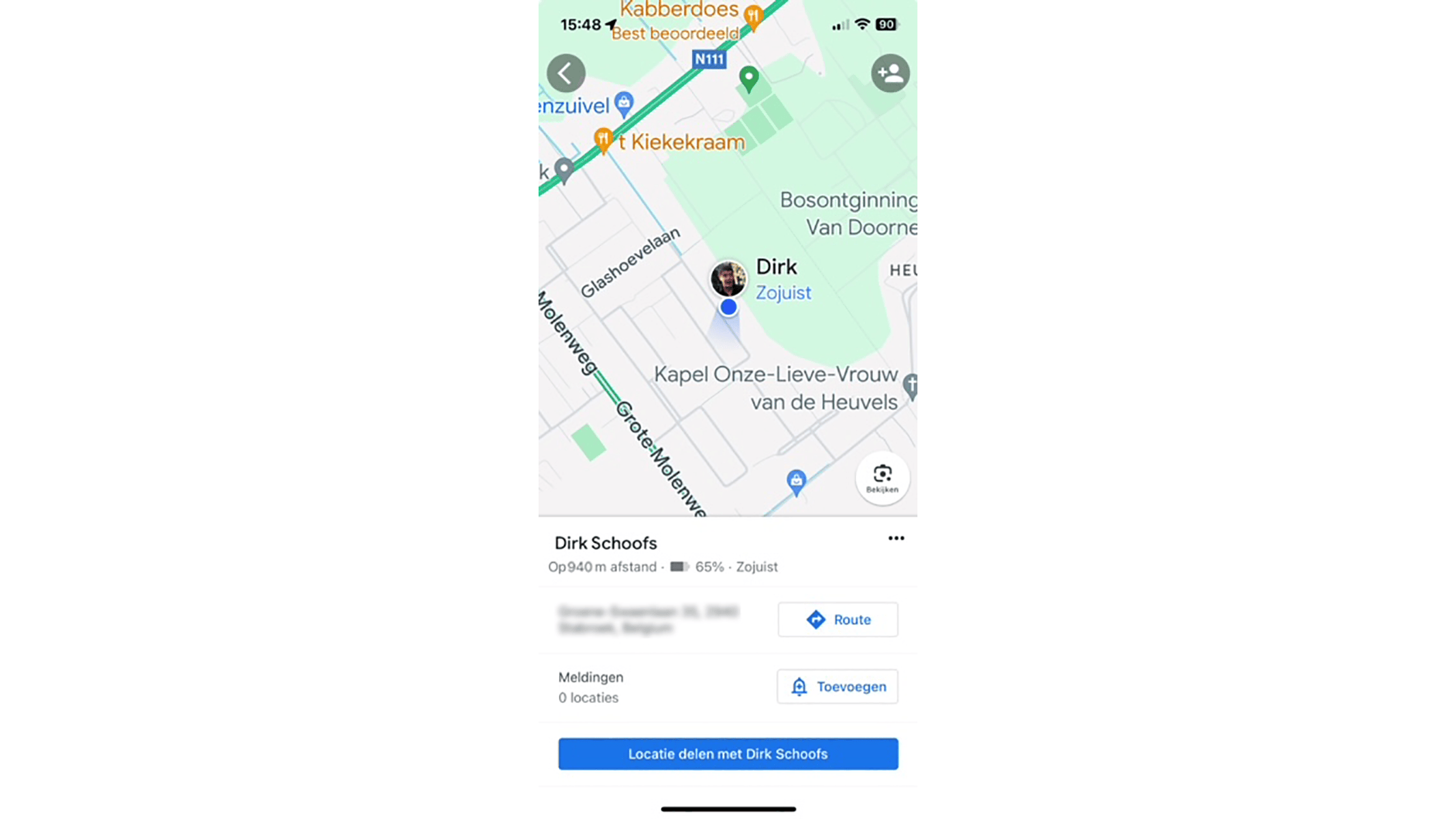 Nadat je via Route onderweg bent naar elkaar, kun je de optie Voortgang van reis delen activeren. Daarmee kan je contactpersoon zien op welk moment jullie samenkomen.
