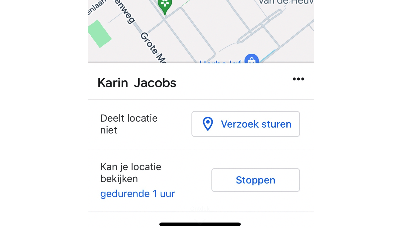 Als de ander niet spontaan zijn locatie met jou deelt, dan kun je een verzoekje sturen omdat alsnog te doen. Daarvoor moet je uiteraard eerst jouw locatie met de ander hebben gedeeld. Daarna tik je onderaan op zijn naam en daarna op Verzoek sturen.