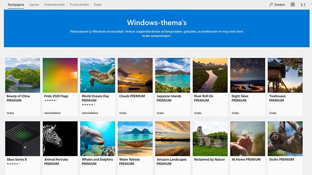 Laten we in het kort nog eens kijken naar hoe je zo'n thema binnenhaalt. Klik met je rechtermuisknop op je bureaublad en kies Aan persoonlijke voorkeuren aanpassen. Ga naar Thema's en klik op Meer thema's in de Microsoft Store downloaden. De Store opent en je ziet dat je de keuze hebt uit honderden gratis thema's.