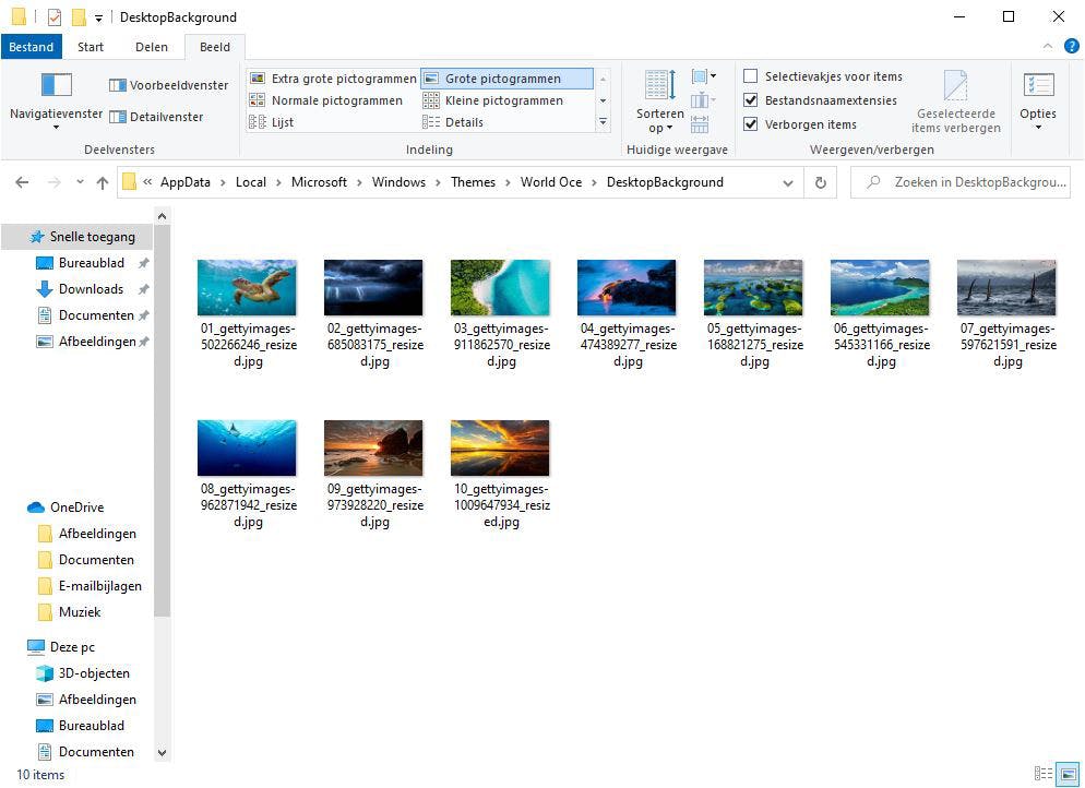Elk geïnstalleerd thema heeft hier zijn eigen mapje gekregen. Binnen zo'n map staan de afbeeldingen in de map DesktopBackground, zoals je hierboven ziet. Je kunt de plaatjes hier kopiëren naar een andere map of simpelweg verwijderen. Stel ze eventueel veilig op een usb-stick of externe schijf, waarna je de beelden ook naar een andere pc kunt overzetten. Of klik er met de rechtermuisknop op en kies Als bureaubladachtergrond gebruiken.