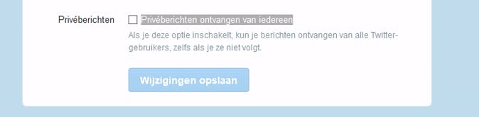 Daar verwijder je het vinkje bij Privéberichten ontvangen van iedereen. Je kunt nu uiteraard nog steeds privéberichten ontvangen, maar - net als vroeger - alleen van de mensen die je daadwerkelijk volgt. Dat maakt Twitter een stuk prettiger in het gebruik.