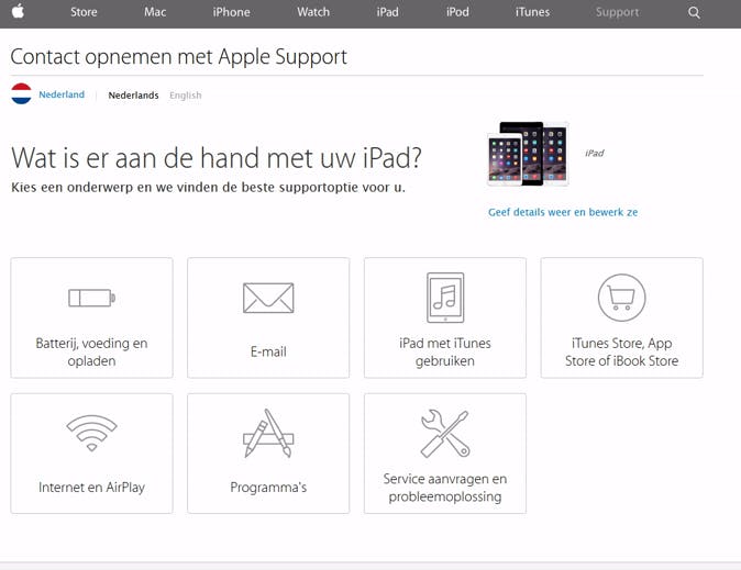 Om een iPad-reparatie in te dienen bij Apple, surf je naar de website en kies je voor iPad. Vervolgens geef je aan wat er aan de hand is en vul je je e-mailadres in. Apple stuurt een link die je dient te openen op je iPad, zodat er een diagnostische check kan worden uitgevoerd. Hierna kun je ervoor kiezen om je iPad op te sturen, te chatten of bellen met Apple Support of je iPad langs te brengen in de Apple Store.