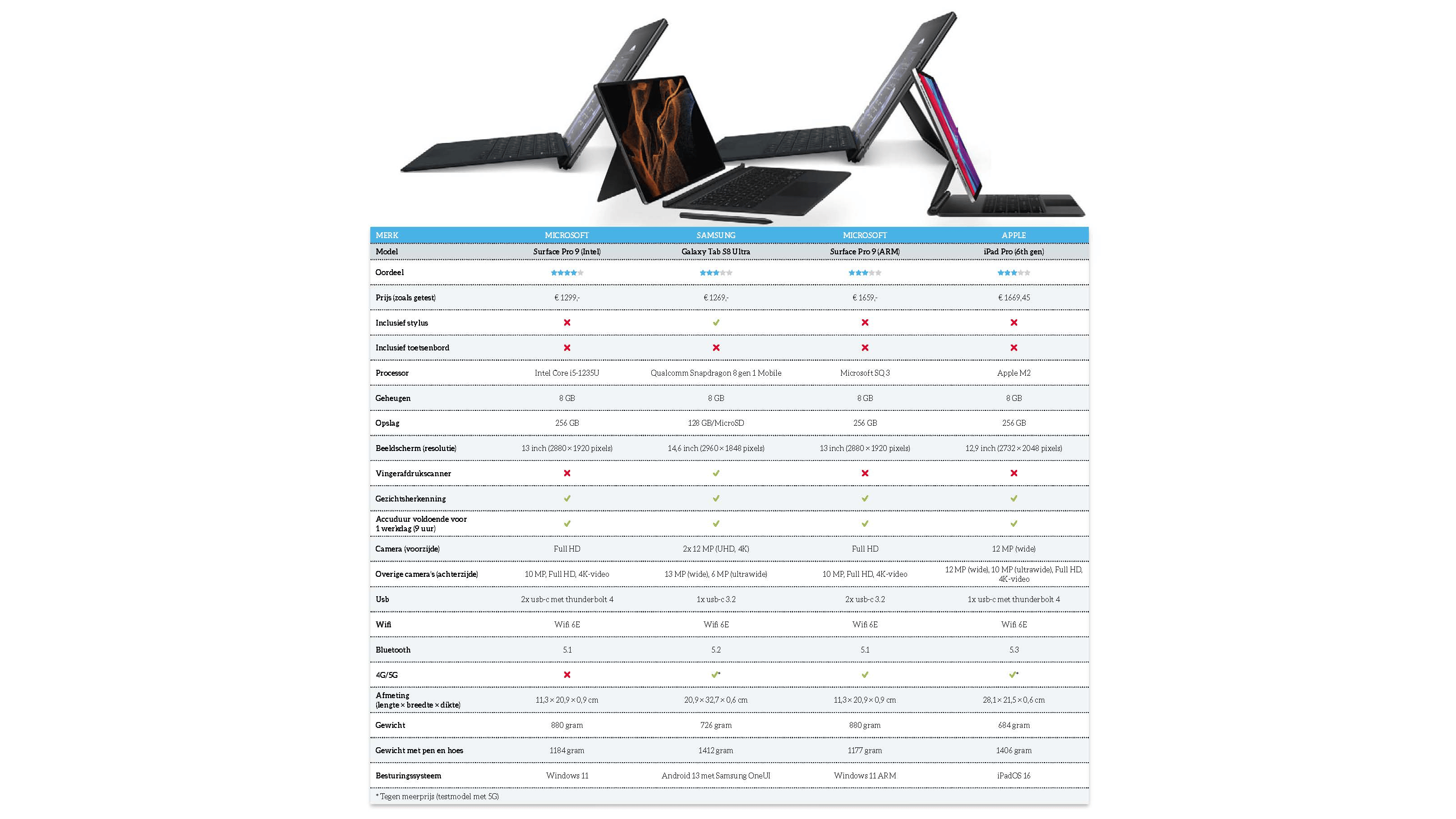 Gevraagd naar hun beste opties voor onze test kregen we van Microsoft twee modellen Surface Pro 9, van Apple de zesde generatie iPad Pro en van Samsung de Galaxy Tab S8 Ultra. We hebben deze apparaten beoordeeld op hun geschiktheid voor hybride werken voor normale (kantoor)werkzaamheden.