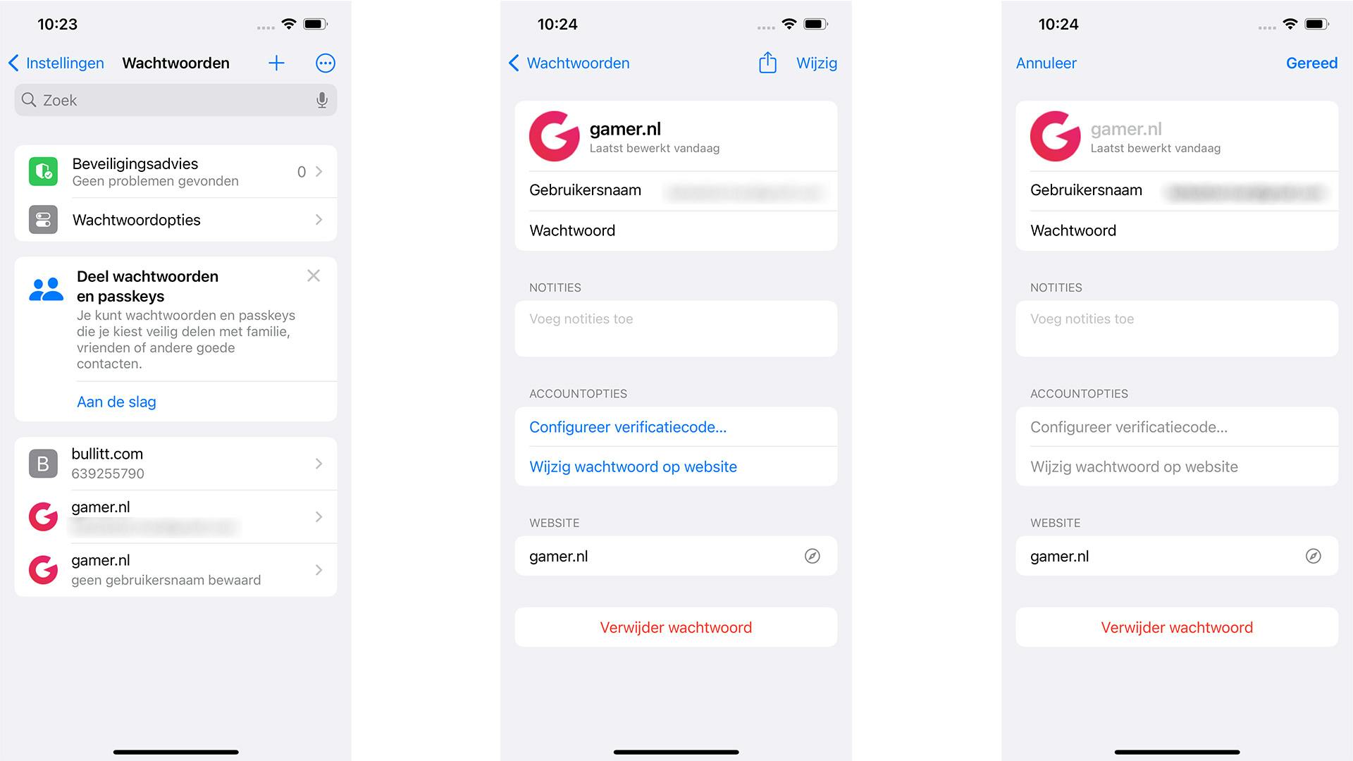 Daarna krijg je een lijst met wachtwoorden te zien. Door op een website- of appnaam te tikken, kun je de informatie wijzigen. Daarvoor tik je rechts bovenin op Wijzig. Dan kun je de gebruikersnaam en het wachtwoord veranderen (vooral handig als je de accountgegevens al online hebt aangepast en je dit ook op je apparaat goed wilt hebben staan).
