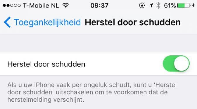 Gelukkig is dat eenvoudig te verhelpen. Navigeer in je iPhone naar Instellingen / Algemeen / Toegankelijkheid. Scrol een stukje naar onderen totdat je de optie Herstel door schudden ziet. Druk hierop en zet de schakelaar om naar Uit. Zodra je dit hebt gedaan kun je schudden wat je wilt, maar je handelingen zullen niet ongedaan gemaakt worden. Niet te hard schudden trouwens, want als die iPhone uit je handen vliegt, kan dat zéker niet ongedaan gemaakt worden.