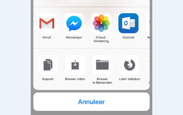 Neem nu je bericht op zoals je dat normaal ook zou doen en verstuur het. De Animoji wordt nu verstuurd naar de ontvanger als filmpje, en daarin schuilt de oplossing. Een filmpje kun je namelijk vanuit iMessage redelijk eenvoudig delen met anderen. Om dit te doen druk je op het filmpje van je Animoji en vervolgens linksonder op het pictogram Delen. In het menu dat verschijnt kies je nu Messenger om het filmpje te versturen naar een contactpersoon op Facebook Messenger.