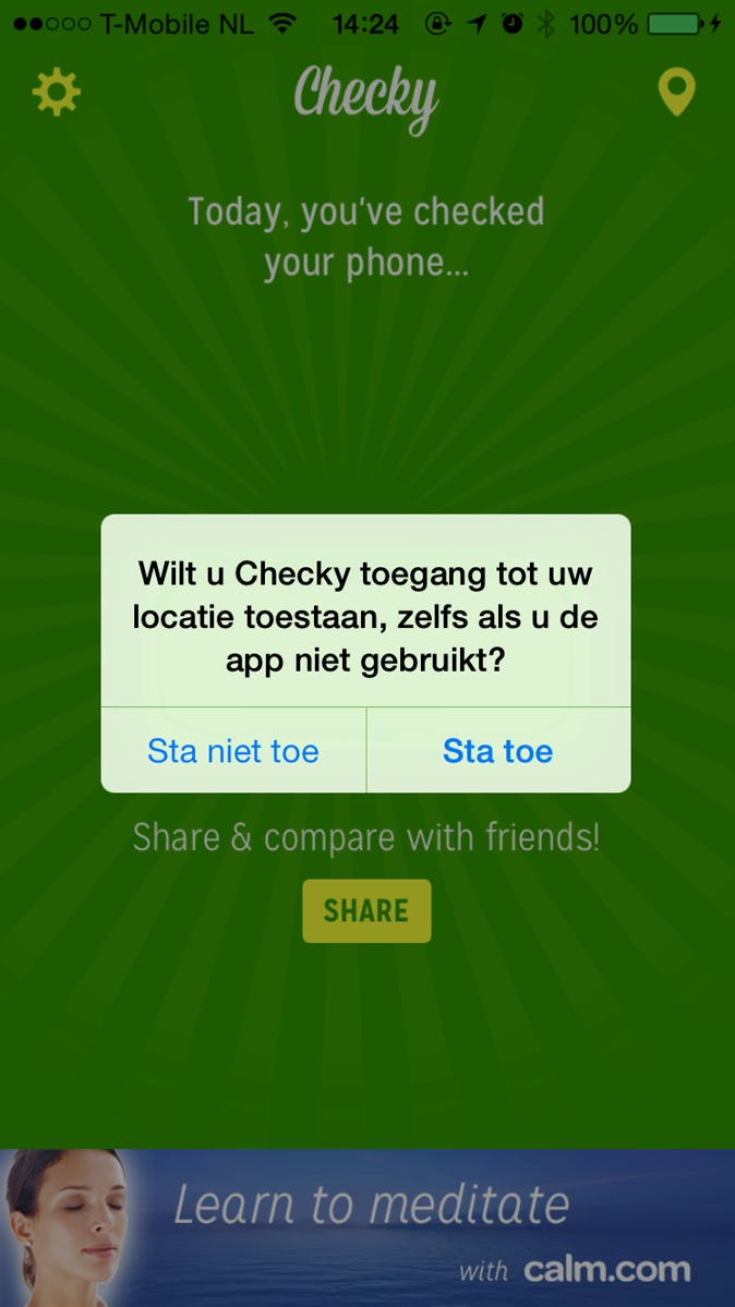 Het enige dat deze app doet (die je gratis kunt downloaden uit de App Store) is bijhouden hoe vaak je je iPhone uit standby-modus haalt om erop te kijken. Dit door middel van een counter. Wil de app dit kunnen doen, dan dien je deze na de installatie wel toestemming te geven om bepaalde zaken bij te houden (dat betekent dus dat de app zichzelf wil kunnen bijwerken op de achtergrond). Dat is geen probleem, maar realiseer je wel dat dit wat meer batterij kost. Lees ook: 20 iPhone-geheimen onthuld.