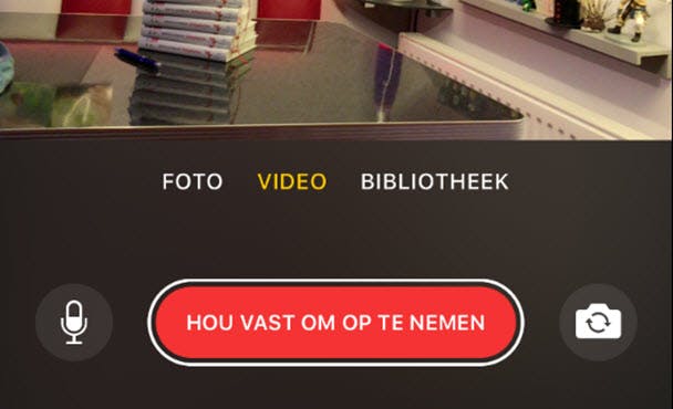 Als je drukt op Foto en daarna een foto neemt, dan ben je nog niet klaar. Je moet namelijk bepalen hoe lang de foto in beeld is. Daarvoor houd je de rode balk ingedrukt. De foto is net zo lang in beeld als je de balk ingedrukt houdt. Bij video werkt dat natuurlijk anders, de video is immers zo lang in beeld als deze duurt. Voeg je iets toe uit de bibliotheek, dan werkt dat hetzelfde: een video duurt zolang als hij duurt, een foto die je selecteert dien je toe te voegen door de rode balk ingedrukt te houden.